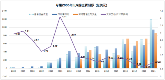与此相对应的是,2011年苹果的资本开支绝对值上并不低,共有75亿美元,后续也基本上维持这样的水准,但资本开支与折旧摊销的比值却逐年下降,最近三年这个水平还不到1,这表明苹果现有的资本开支还不够维持正常的简单再生产的水平。