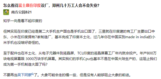 比如这位网名“南方公园821”的知乎网友,就看好富士康在印度的前景。