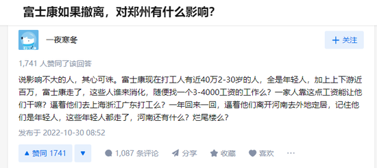 再比如这位知乎“一夜寒冬”的网友,表达了富士康对郑州的重要性。