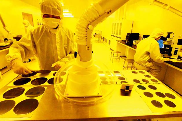 山东潍坊一家LED芯片生产企业净化车间内,工作人员在对LED芯片进行电极蒸镀。图/新华
