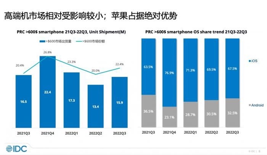 (高端市场在疲软环境中抗风险能力更强,而苹果已经开始有点面临安卓阵营的份额竞争。图源:IDC)