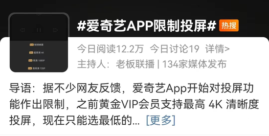 另据报道,此前用户使用爱奇艺App投屏时,黄金VIP会员支持最高4K清晰度投屏,而 2023 年 1 月,不少用户反应爱奇艺将黄金 VIP 会员投屏清晰度限制在480P。 对此,爱奇艺客服曾表示,黄金会员可以在电脑、平板和手机端使用,同时可使用480P清晰度进行投屏;若需要更高清晰度投屏,需要开通白金会员或在电视端上观看播放。爱奇艺的这一做法引起不少网友不满。 有网友留言道:“吃相难看”“这个真的过分了吧”“请问现在还有人想要在电视大屏上看480p的东西吗?”……