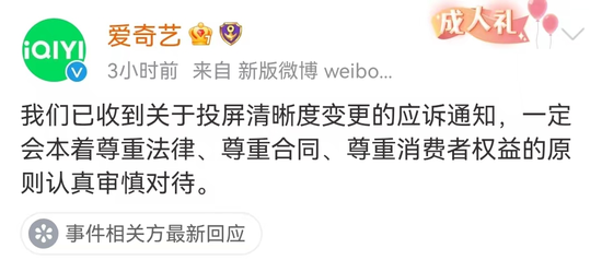 2月1日,爱奇艺在官方微博上发布声明称,已收到关于投屏清晰度变更的应诉通知,一定会本着尊重法律、尊重合同、尊重消费者权益的原则认真审慎对待。